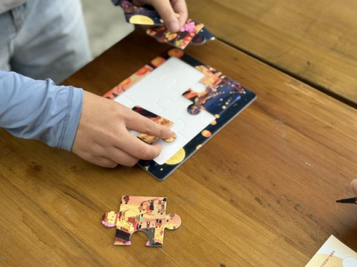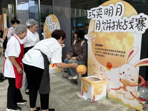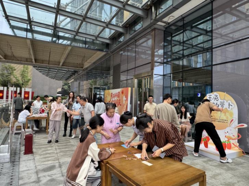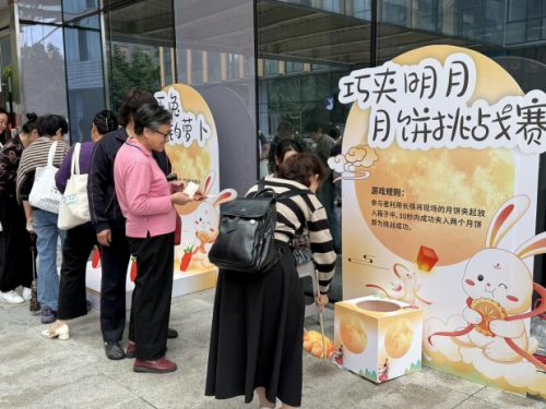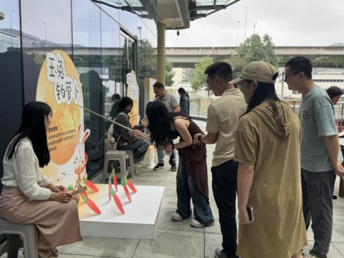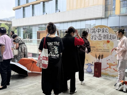活动内容设计兼具趣味性与文化底蕴。游园会核心环节为集章互动体验,共设有五个主题游戏点位,每个点位都巧妙融入了双节元素,在“家国同心”拼图挑战中,参与者在一分钟内拼接国庆、中秋主题拼图,于动手实践中重温家国故事,强化“国是大的家,家是小的国” 的认知;“月满中秋”投壶雅趣还原传统民俗,2米长的投壶区里,木质投壶与箭矢承载着千年文化底蕴,参与者投掷箭矢的过程既是对传统礼仪的传承,也是对节日氛围的生动演绎;“巧夹明月”月饼挑战赛以长筷夹取月饼形状抱枕为任务,在30秒的限时挑战中,既考验手部协调性,又让“中秋团圆”的文化符号深入人心;嫦“鹅”奔月套圈圈与玉兔钓萝卜则以童话化的创意设计,将中秋神话元素转化为趣味互动,1.5米外的套圈投掷、30秒内的吊杆钓萝卜,让不同年龄层的参与者都能享受竞技与合作的乐趣。参与者完成任意四项游戏即可获得盖章,凭集章卡在兑奖处兑换精美礼品,让每一份收获都成为双节记忆的珍贵载体。