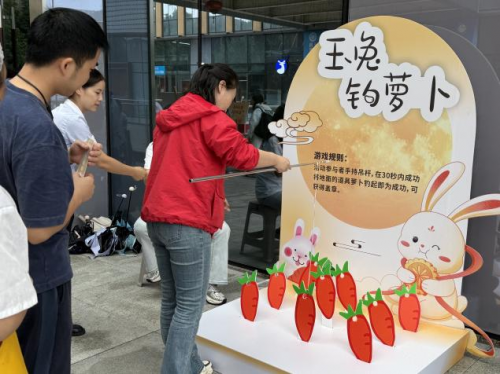 活动内容设计兼具趣味性与文化底蕴。游园会核心环节为集章互动体验,共设有五个主题游戏点位,每个点位都巧妙融入了双节元素,在“家国同心”拼图挑战中,参与者在一分钟内拼接国庆、中秋主题拼图,于动手实践中重温家国故事,强化“国是大的家,家是小的国” 的认知;“月满中秋”投壶雅趣还原传统民俗,2米长的投壶区里,木质投壶与箭矢承载着千年文化底蕴,参与者投掷箭矢的过程既是对传统礼仪的传承,也是对节日氛围的生动演绎;“巧夹明月”月饼挑战赛以长筷夹取月饼形状抱枕为任务,在30秒的限时挑战中,既考验手部协调性,又让“中秋团圆”的文化符号深入人心;嫦“鹅”奔月套圈圈与玉兔钓萝卜则以童话化的创意设计,将中秋神话元素转化为趣味互动,1.5米外的套圈投掷、30秒内的吊杆钓萝卜,让不同年龄层的参与者都能享受竞技与合作的乐趣。参与者完成任意四项游戏即可获得盖章,凭集章卡在兑奖处兑换精美礼品,让每一份收获都成为双节记忆的珍贵载体。
