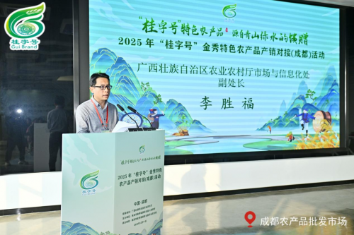 广西壮族自治区农业农村厅市场与信息化处副处长李胜福出席活动并致辞。他表示,广西特色农业发展显著,六大产业品牌价值超5000亿元,连续三年支持产销对接活动。成都作为西部农业优势中心,活动将促进两地交流,提升广西农产品品牌。广西邀请各界实地考察,深化合作。