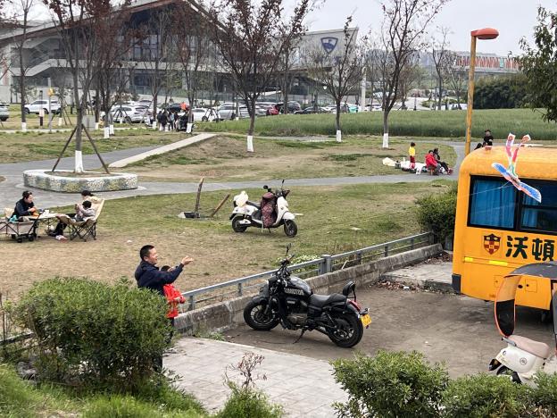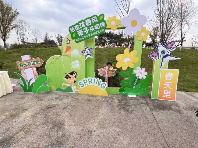 活动伊始,社区工作人员早已做好充分准备,活动现场秩序井然、暖意融融。签到区前,亲子家庭有序排队,依次领取纸鸢彩绘材料包与露营地垫,材料包里的空白纸鸢、五彩颜料、画笔等一应俱全,露营地垫则为亲子们提供了舒适的创作休憩空间。同时,社区特意设置了主题广告美陈拍照打卡点,色彩鲜艳的春日布景与纸鸢元素相得益彰,家长们纷纷带着孩子驻足打卡,定格下春日里的温馨瞬间,为活动增添了浓厚的欢乐氛围。